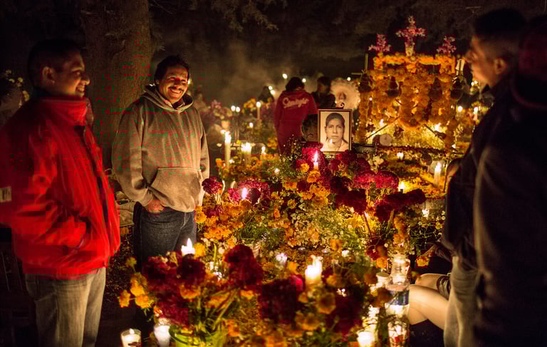 The day of the dead is a Mexican festival to celebrate the departed souls of loved ones. The cemeteries which often represent a dead view by the world, suddenly looks alive with millions of candle light and people hovering around them. It is not only beautiful but a very spiritual experience. Family members gather around the tombstones often singing, sharing jokes or sometimes just being there quietly.